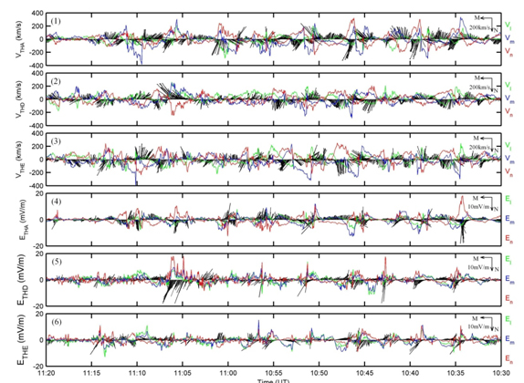 图2. THEMIS卫星在昏侧低纬边界层观测到的速度场和电场表明了涡旋结构的存在以及由此造成的磁层顶扭曲。