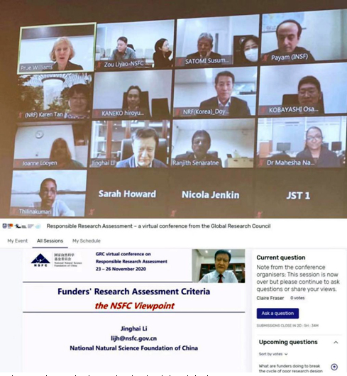 国家自然科学基金委员会(以下简称自然科学基金委)主任李静海院士出席了该系列会议的线上座谈环节,进行了题为“资助机构的研究评估标准”的主旨报告,介绍了自然科学基金委正在开展的基于四类科学问题属性的分类申请与评审,以及“负责任、讲信誉、计贡献”的评审机制。此外,李静海主任还参加了相关议题的线上问答环节和亚太区域会议讨论,在会上与各国资助机构负责人及学者代表就负责任的研究评估标准和实施过程中面临的挑战等问题开展了广泛交流与探讨。