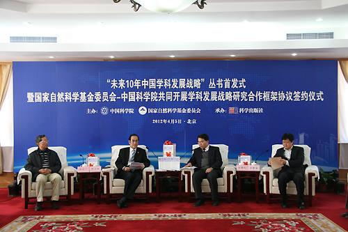 4月5日下午,国家自然科学基金委员会和中国科学院在中国科学院院部签署了共同开展学科发展战略研究合作框架协议,并举行了“未来10年中国学科发展战略”丛书首发式。基金委主任陈宜瑜院士和中科院院长、中科院学部主席团执行主席白春礼院士出席仪式并讲话。基金委副主任孙家广院士与中科院副院长李静海院士代表双方在协议上签字。中科院学部咨询评议工作委员会主任朱道本院士主持仪式。国家自然科学基金委员会副主任沈文庆院士、副秘书长兼办公室主任高瑞平出席签字仪式。