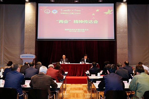 3月15日下午,自然科学基金委召开全体工作人员会议,传达学习贯彻十三届全国人大二次会议和全国政协十三届二次会议(以下简称两会)精神。十三届全国人大常委会委员、自然科学基金委党组书记、主任李静海同志主持会议并传达十三届全国人大二次会议精神。