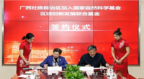 2019年10月25日,广西壮族自治区加入国家自然科学基金区域创新发展联合基金协议签署仪式在北京举行,国家自然科学基金委员会(以下简称自然科学基金委)党组书记、主任李静海和广西壮族自治区费志荣副主席出席仪式并致辞。自然科学基金委党组成员、副主任高瑞平和广西壮族自治区费志荣副主席分别代表双方签署联合基金协议书。广西壮族自治区科技厅,自然科学基金委计划局、生命科学部、地球科学部、工程与材料科学部相关人员参加协议签署仪式。