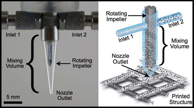 这项研究由哈佛大学约翰·波尔森工程与应用科学学院(SEAS)仿生工程教授詹妮弗·刘易斯负责。据研究人员介绍,打印多种材料的基础是混合复杂液体,以往大部分方法是被动的,即让两股液体扩散混合,对高粘度液体,尤其在容积小、时间短的情况下很难奏效。他们设计了一种主动混合多材料打印头,微喷嘴内有一种旋转推进器,能有效混合多种复杂液体。