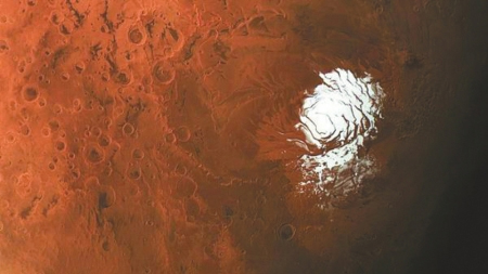 2015年2月25日,欧洲航天局观测到的火星南极冰盖。“火星特快”的观测首次表明,在南极冰盖下隐藏着一片由液态水组成的湖泊。