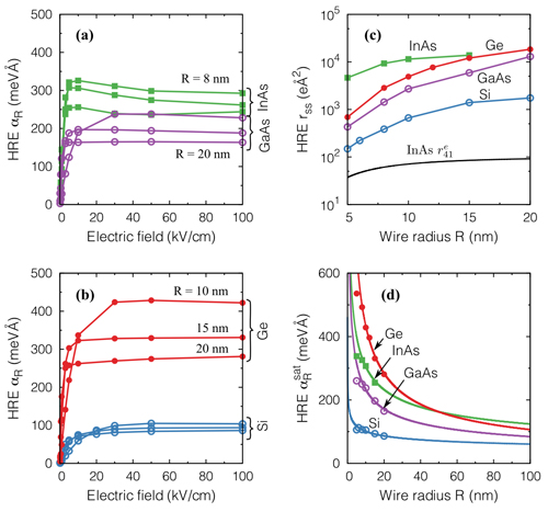 图(a)和(b)显示硅、锗、InAs和GaAs量子线空穴Rashba效应在电场作用下的响应,(c)和(d)分别是Rashba效应的响应速度和饱和值随量子线大小的变化。