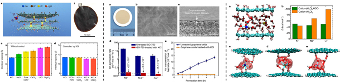 图. 离子精确“装订”氧化石墨烯膜用于离子筛分和海水淡化。(左)阳离子调控氧化石墨烯膜层间距;(中)陶瓷支撑的氧化石墨烯膜的单离子渗透测试;(右)阳离子与两层氧化石墨烯片之间的理论计算。