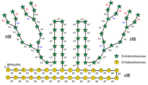 Arabinogalactan是结核分枝杆菌细胞壁重要的抗原性成分之一,具有开发成新型结核病疫苗的潜力。但由于结核分枝杆菌的强致病性及苛刻的培养条件,采用传统的提取分离手段获取多糖抗原十分困难;因此,化学合成是解决该多糖可获得性问题的重要途径。然而该多糖结构十分复杂,由多达92个单糖单元组成,包含一条线性的呋喃半乳聚糖链和两条紧密靠近的高度分支化的呋喃阿拉伯聚糖链,含有398个手性中心,其全合成挑战巨大。