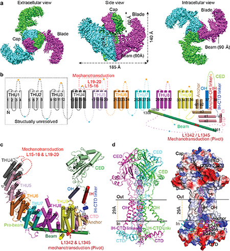 图. a) Piezo1分辨率为3.97Å的冷冻电镜示意图,其中每一个亚基用不同的颜色表示;b) 38次跨膜的Piezo1拓扑结构卡通示意图;c) Piezo1一个亚基细节组成展示图;d) Piezo1成孔区的组成。参与机械力激活Piezo1的胞外loop区以及位于beam上的L1342/L1345位点显示在b及c图。
