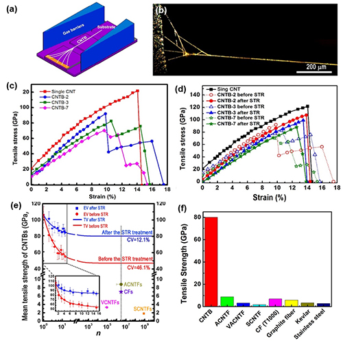图1. 超长碳纳米管管束的结构制备及力学性能。(a)利用气流聚焦法制备超长碳纳米管管束的示意图;(b)TiO2修饰后的碳纳米管管束光学显微镜照片;(c-e)碳纳米管管束的力学性质;(f)超长碳纳米管管束与其他材料拉伸强度对比图。