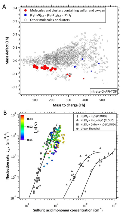 王琳教授团队针对这一主题在我国典型城市上海开展了2年连续大气观测,利用国际上最新发展的纳米颗粒物粒径放大技术测得了真实大气中1-700 纳米区间大气颗粒物的粒径分布浓度,获得了大气新粒子形成事件中新粒子的形成速率和成长速率;并应用大气常压界面-飞行时间质谱和硝酸根试剂离子化学电离-飞行时间质谱技术,测量了大气新粒子形成事件期间大气中性和带电分子簇的化学组分。研究中观测到了世界各地大气外场观测中最高的硫酸二聚体质谱信号,并识别了多个关键硫酸-二甲胺分子簇,所得的真实大气中新粒子形成速率与实验室中硫酸-二甲胺-水三元成核模拟实验所得的新粒子形成速率具有一致性。这是首次在外场观测中发现并证实硫酸-二甲胺-水三元成核机制可以用于解释我国典型城市大气中的大气新粒子形成事件。