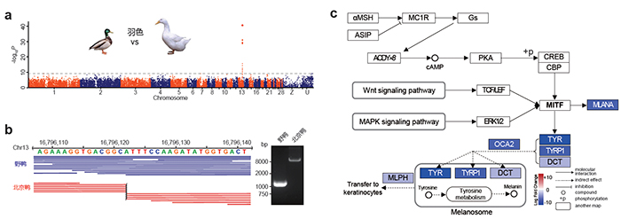 图1. 北京鸭羽色白化的遗传机制 a.羽毛颜色GWAS分析,b.MITF基因的6.6kb插入位置,c.MITF是黑色素合成的开关基因