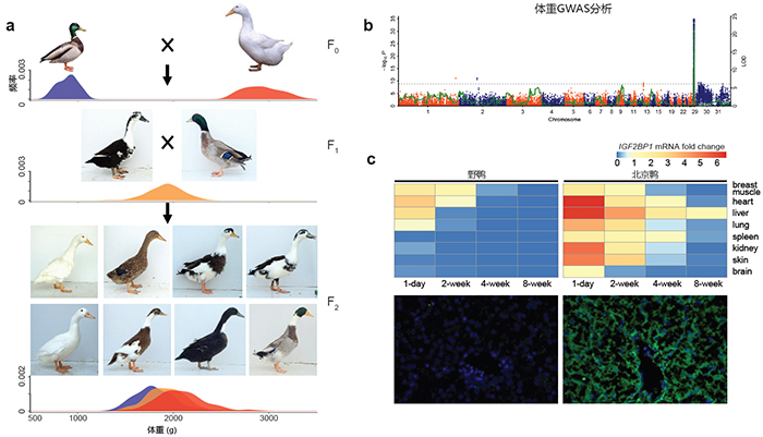 图2. IGF2BP1基因使体格增大。a.野鸭×北京鸭F2资源群体IGF2BP1三种基因型对应的体重分布图,b.F2群体体重GWAS和QTL分析,c.IGF2BP1基因在出生后持续广泛表达。