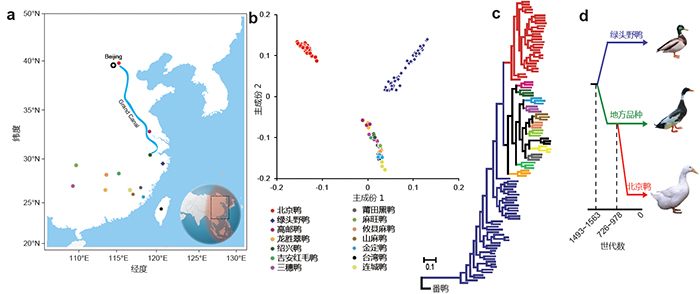 图3. 北京鸭的起源 a.采样分布,b.主成份分析,c.聚类树,d.北京鸭与地方品种的分化时间推断