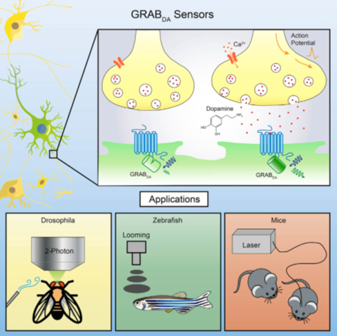 图 多巴胺探针(GRABDA)原理和应用。可基因编码的基于G蛋白偶联受体的GRABDA,将对结构变化敏感的荧光蛋白嵌入人源多巴胺受体,使多巴胺这一化学信号转化为荧光信号,结合现有的成像技术,即可实时监测多巴胺浓度的动态变化情况。可应用于果蝇、斑马鱼和小鼠等自由活动的模型动物,具有极高的时空分辨率。