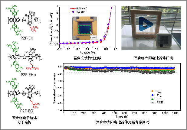 图1. 聚合物电子给体分子结构、聚合物太阳能器件光伏特性曲线、器件光照寿命测试和电池样机