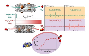 固定化制备具有限域结构的复合材料,是克服纳米材料易团聚失活、操作困难、环境风险大等规模化应用瓶颈的最为有效的策略之一,研究限域条件下纳米材料对污染物的去除转化机制,对于推动纳米水处理化学向实用化方向发展具有重要的基础性意义。但目前这一方向的研究还未得到充分关注。潘丙才研究组以经典的类Fenton催化体系为研究对象,选用多壁碳纳米管(CNT,内径~7 nm)为Fe2O3 (~2 nm)的模板载体,分别制备出管内与管外负载Fe2O3的复合催化剂Fe2O3@CNT与Fe2O3/CNT,比较研究了两种催化剂介导的类Fenton反应降解有机污染物的性能与机制。研究发现,Fe2O3/CNT-H2O2类芬顿体系降解有机污染物的活性物种为经典的羟基自由基(.OH),而Fe2O3@CNT-H2O2产生的活性物种仅为单线态氧(1O2),且相同条件下后者对亚甲基蓝的降解速率是前者的22.5倍。不仅如此,在pH值5-9的范围内,Fe2O3@CNT-H2O2均可保持高效稳定的污染物降解性能,这大大拓展了类芬顿催化剂在碱性条件下的应用;另外,限域催化体系可选择性氧化易被吸附的有机污染物,氧化速率与吸附亲和力成线性关系。其原因是碳纳米管的限域结构从动力学与热力学两方面影响了Fenton催化的反应路径。这项工作为限域条件下环境纳米催化新技术的发展提供了重要参考。