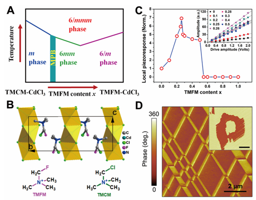 A.(TMFM)x(TMCM)1-xCdCl3(0 ≤ x ≤ 1)相图示意图;B. (TMFM)x(TMCM)1-xCdCl3(0 ≤ x< 0.25)的结构图以及TMFM与TMCM的结构示意图;C. (TMFM)x(TMCM)1-xCdCl3(0 ≤ x ≤ 1)不同组分下的相对压电响应;D. (TMFM)x(TMCM)1-xCdCl3(x = 0.25)的铁电畴和畴的极化翻转。