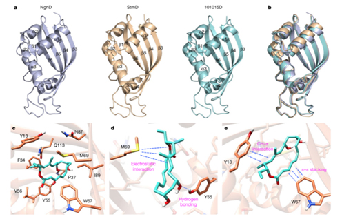 随后,谭仁祥-戈惠明课题组设计了两步串联的酶反应在体外来验证周环酶的催化功能,证明了StmD和NgnD都可以同时催化[4+2]和[6+4]反应;进而又以StmD为探针,从基因数据库中挖掘鉴定出了另外三个可催化[6+4]反应的酶。此外,该课题组还获得了StmD、NgnD和101015D三个蛋白的晶体来进一步研究该反应的催化机理(图1),并通过分子对接、计算机模拟和点突变实验,阐明了此类新型环加成酶的反应机制。