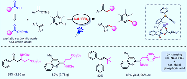 在国家自然科学基金项目(批准号:21572212,21732006,51821006)的资助下,中国科学技术大学傅尧和尚睿研究团队在可见光催化合成反应领域取得重要突破。相关研究成果以“Photocatalytic Decarboxylative Alkylations Mediated by Triphenylphosphine and Sodium Iodide”(三苯基膦和碘化钠介导的光催化脱羧烷基化反应)为题,于2019年3月29日在线发表在国际权威期刊Science(《科学》)。论文链接:http://science.sciencemag.org/content/363/6434/1429。