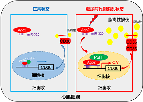 糖尿病患者通常伴有心血管系统并发症,这也是糖尿病患者死亡的主要原因。以往多认为糖尿病通过影响内皮细胞功能导致血管功能障碍和冠心病,然而糖尿病导致心力衰竭几率是非糖尿病者的3倍以上,但对其导致心肌细胞功能障碍及其机制知之甚少。该研究团队首先通过高通量测序和芯片等技术在临床患者样本和多种模式动物中筛查出心脏miR-320表达增高与糖尿病心功能损伤密切相关。同时发现心脏特异性高表达miR-320会加重糖尿病db/db小鼠的心脏功能损伤,而抑制心脏中miR-320的表达可以减轻糖尿病小鼠的心功能损伤。该研究团队利用ChIP-seq等技术进一步研究发现,miR-320在细胞核中促进Ago与RNA聚合酶II结合,进而促进CD36基因的转录;显著高表达的CD36促进心肌细胞摄取过多的中性脂肪酸,从而引起心脏的脂质毒性、促进心肌细胞凋亡,损伤心功能而致糖尿病心肌病形成。