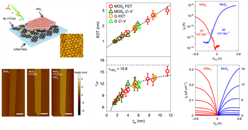 图. 在二维材料上沉积的超薄high-k栅介质层以及晶体管特性曲线示例