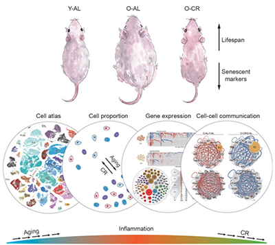 刘光慧、曲静和张维绮等研究团队通过单细胞测序技术,首次绘制了哺乳动物衰老和节食状态下的9种组织器官共计20多万个单细胞和单核转录组图谱。研究发现,多组织免疫炎症压力的升高是衰老的标志性特征。一方面,节食可以有效地逆转免疫细胞比例在衰老过程中的异常变化。另一方面,在衰老过程中约四分之一因衰老而改变的基因表达能够被节食逆转。这些可逆转表达的基因主要为编码炎症反应和脂质代谢相关的调控蛋白和转录因子,其中,S100a8,Ybx1等基因可能是介导多组织衰老,且受节食调控的关键性节点分子或标志物。此外,研究者还发现衰老能够导致多种组织的细胞间通讯过载,而节食可以抑制这些异常变化。