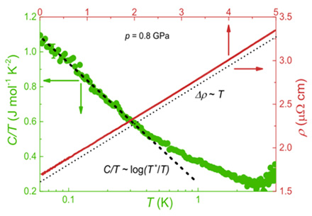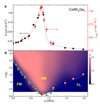 量子相变是当今凝聚态物理的一个前沿研究领域,广泛存在于不同的量子材料体系中。而磁性量子相变是研究最广泛的一类量子相变。反铁磁类型量子临界点广泛存在于重费米子体系、铜基高温超导体、铁基超导体以及有机超导体等强关联电子体系中,在临界点附近存在超导和奇异金属行为。然而,铁磁量子是否也存在临界点,尚缺乏确凿的证据。为了寻找铁磁量子临界点,揭示铁磁量子临界现象,浙江大学袁辉球教授与合作者,在探索了多种材料体系后,首次在近藤晶格材料CeRh6Ge4中发现了铁磁量子临界点存在的确凿实验证据。CeRh6Ge4具有准一维晶体结构,并在2.5K以下发生铁磁相变。为了避免元素替换引起的无序效应,该团队将压力作为调控手段。通过对极端条件下的电阻、比热、磁化率等物性测量,发现该化合物的铁磁序随着压力的增加而逐渐被抑制,当压力pc 0.8GPa时,出现了铁磁量子临界点。他们还发现,在铁磁量子临界点附近,电阻在低温极限下随温度线性变化,比热系数随温度对数发散,表现出与铜氧化合物高温超导体类似的奇异金属行为。