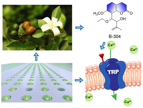 该研究团队开发了一种单细胞微流控装置,通过优化微坑尺寸捕获单细胞,采用无泵被动阀技术实现微量、低剪切力的换液过程,提高了筛选效率。研究团队利用该技术装置,对近200个中药成分进行五种TRP通道亚型的调控活性筛选,从具有行气止痛功效的中药九里香中发现了4个活性成分。通过体内模型研究,进一步证实香豆素类活性成分B304能够通过抑制TRPA1减轻福尔马林或异硫氰酸烯丙酯(AITC)引起的小鼠疼痛反应,验证了该筛选体系的可靠性。