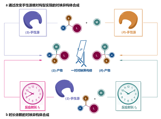 合成手性分子的一对对映异构体是不对称合成的基本任务,对于药物化学具有重要意义。在不对称合成的传统认知中,手性产物分子的绝对构型是由反应体系中的手性源(如手性底物、辅基、试剂、催化剂/配体等)控制的。要合成手性分子的一对对映异构体通常需要一对绝对构型相反的手性源(图a)。科研团队利用单一绝对构型的手性催化剂,仅通过调控反应时长实现了手性目标分子的一对对映异构体合成(图b)。
