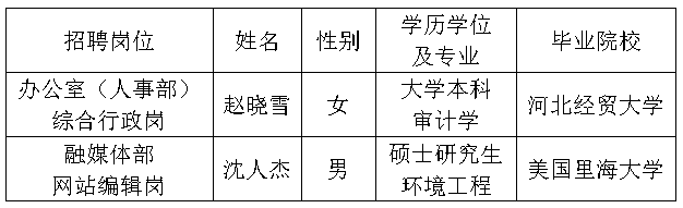 根据招聘工作程序,确定以下同志作为国家自然科学基金委员会科学传播与成果转化中心办公室(人事部)综合行政岗、融媒体部网站编辑岗拟聘用人员,按照有关规定,现予以公示,期限为5个工作日(2022年1月25日至2022年1月29日)。