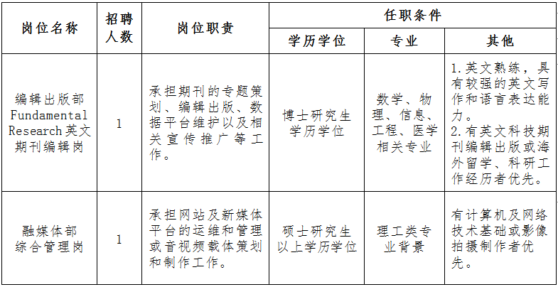 国家自然科学基金委员会科学传播与成果转化中心(科学基金杂志社)是国家自然科学基金委员会直属事业单位。主要承担国家自然科学基金发展战略、资助政策与资助绩效传播,资助成果宣传、推广与转化,《中国科学基金》和Fundamental Research期刊编辑出版等工作。根据工作需要,现面向社会招聘合同制工作人员。