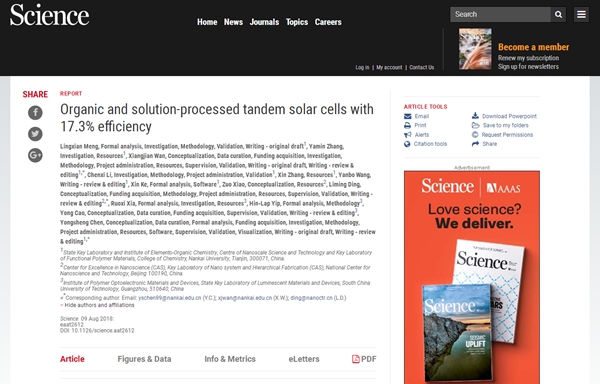 南开新闻网讯(记者 吴军辉)记者获悉,南开大学化学学院陈永胜教授领衔的团队在有机太阳能电池领域研究中获突破性进展。他们设计和制备的具有高效、宽光谱吸收特性的叠层有机太阳能电池材料和器件,实现了17.3%的光电转化效率,刷新了目前文献报道的有机/高分子太阳能电池光电转化效率的世界最高纪录。这一最新成果让有机太阳能电池距离产业化更近一步。美国东部时间8月9日下午,介绍该研究的论文在线发表于国际顶级学术期刊《Science》上。