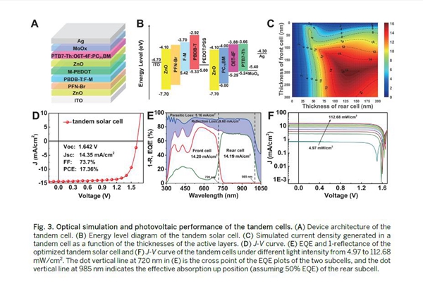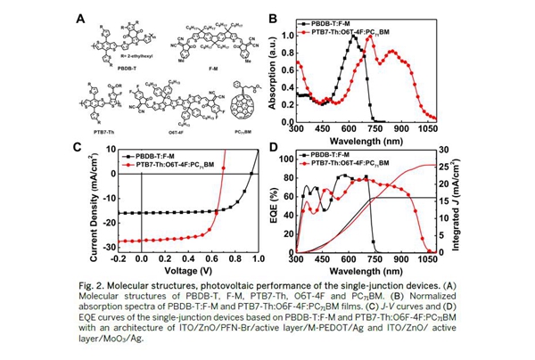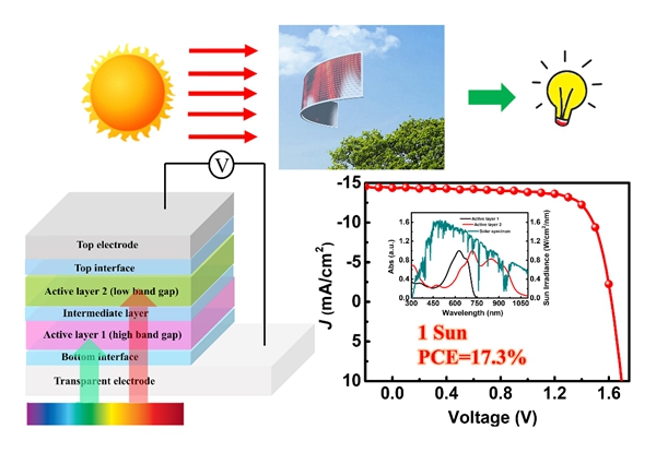 陈永胜教授团队与中科院国家纳米科学中心丁黎明教授、华南理工大学叶轩立教授研究团队合作,首先利用半经验模型,从理论上预测了有机太阳能电池实际可以达到的最高效率和理想活性层材料的参数要求。在此基础上,他们以在可见光区域和近红外区域具有良好互补吸收的PBDB-T:F-M和PTB7-Th:O6T-4F:PC71BM分别作为前电池和后电池的活性层材料,采用成本低廉、与工业化生产兼容的溶液加工方法,制备得到了高效的有机太阳能垫层器件,获得了17.3%的验证效率。