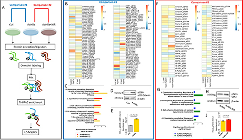 研究人员采用稳定同位素标记磷酸化蛋白质组学定量分析技术,发现金纳米棒的光热效应可以显著改变肌动蛋白系统和细胞连接系统中相关蛋白质、蛋白质相互作用网络及信号通路的磷酸化修饰状态。相关研究结果揭示了金纳米棒在调节和重塑肌动蛋白丝和细胞连接蛋白中可能的分子机制,为后续抑制癌细胞群体扩散提供了新的解决思路。