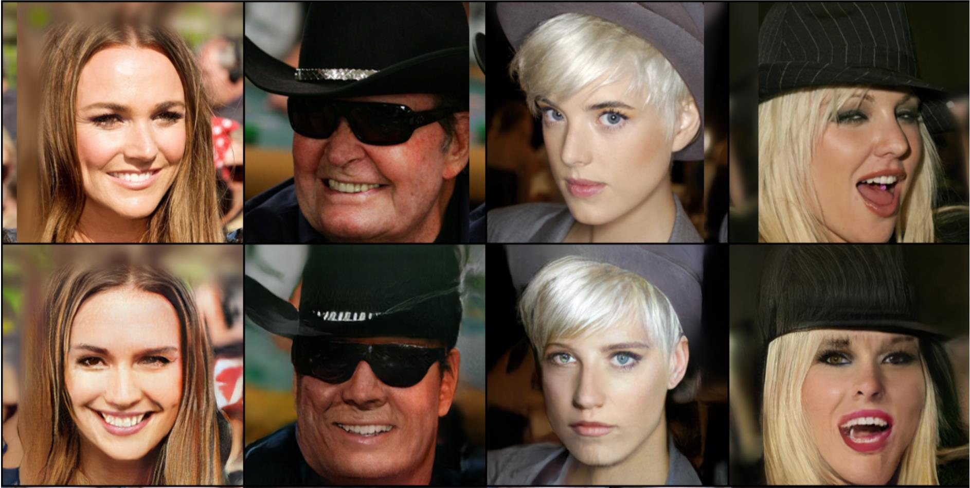 在IJBA数据库上的可视化结果,第一行为输入图像,第二行为通过我们的模型进行人脸正面化后的结果。
