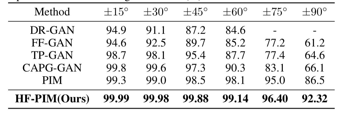 近日,自动化所曹杰、胡一博、张鸿文、赫然、孙哲南在论文Learning a High Fidelity Pose Invariant Model for High-resolution Face Frontalization中提出了高保真度的姿态不变模型(High Fidelity Pose Invariant Model, HF-PIM)来克服人脸识别任务中最为经典的姿态不一致问题。实验结果表明,该方法在多个基准数据集的视觉效果和定量指标都优于目前已有的最好方法。此外,HF-PIM所支持的生成图像分辨率也在原有方法的基础上提升了一倍。