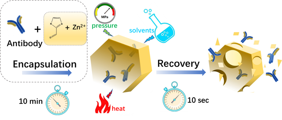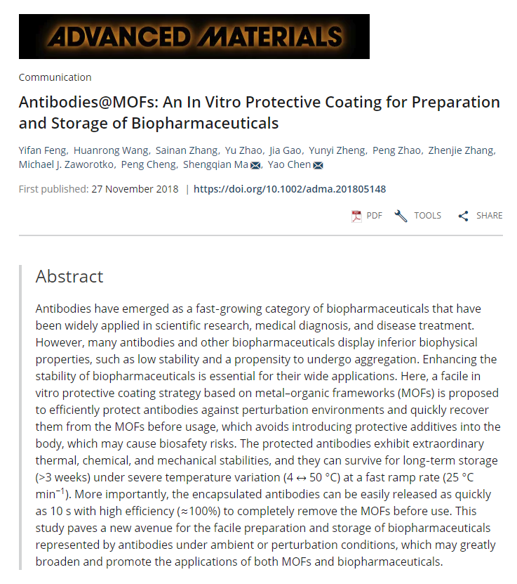 陈瑶团队创造性地将金属-有机框架材料与抗体类生物制剂结合,对多克隆抗体和广泛市售的单克隆抗体药物(阿达木)进行了“包裹”,通过反复测试,最终筛选出适用于抗体的金属-有机框架材料保护策略,并对该新策略的安全性和保护性能进行了多方面测试。