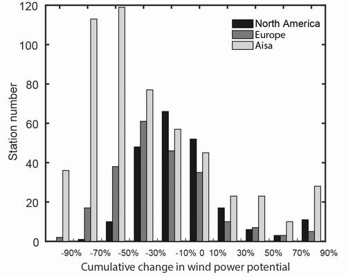 ▲风能资源累计变化频数分布。1979-2016年风能资源累计变化,不同颜色分别代表北美洲、欧洲和亚洲。(袁一雪)
