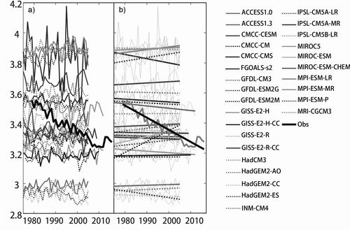 ▲CMIP5模拟地面风速变化。a)28个CMIP5全球气候模式模拟的北半球中位数风速变化。b)风速变化的趋势线。其中17个模式呈现风速下降趋势,其余模式呈现上升趋势。地面观测的中位数风速变化也在图中绘出。