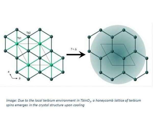 由于TbInO3内局部铽环境,一种铽自旋蜂巢网格出现在晶体结构内。图片来源:物理学家组织网