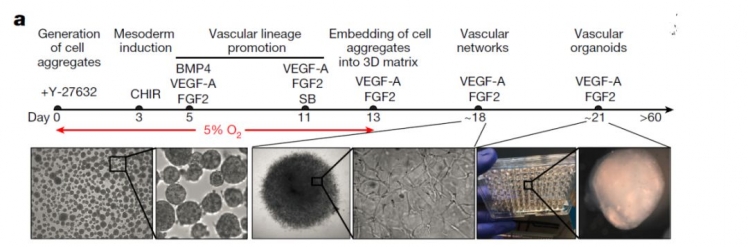 从人多功能干细胞诱导分化成微型血管类器官的方案示意图,图来自nature.com