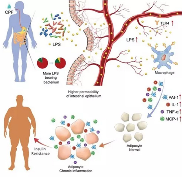 课题组相关负责人介绍,长期暴露有机磷农药毒死蜱会导致胰岛素抗性及肥胖,其机制主要有两方面,第一,毒死蜱通过食物进入消化系统后,首先能够破坏肠道完整性,使得进入血液中内毒素的量增加,引发低度炎症,进而导致胰岛素抗性及肥胖;第二,毒死蜱可以改变肠道中的菌群组成,这种被改变的肠道菌群组成会反作用于宿主,加重机体胰岛素抗性及肥胖的症状。
