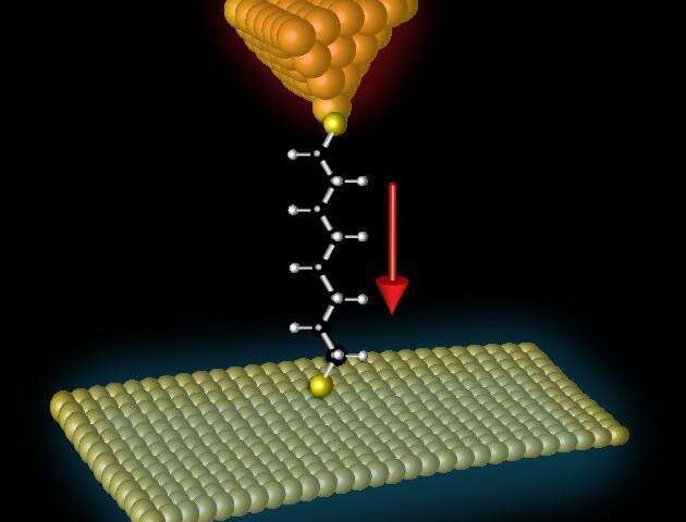 该图显示了通过单个分子(一个桥接室温电极和加热电极尖头原子级尖端的碳原子链)的热。图片来源:物理学家组织网