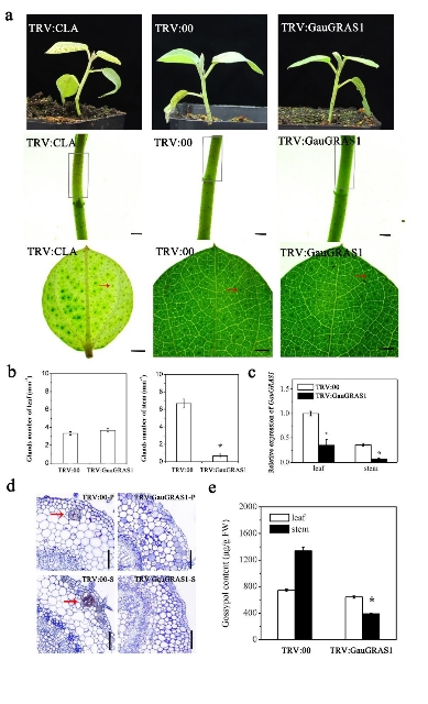 通过多组学、正向选择分析和基因功能验证,科学家发现了响应独脚金内酯、茉莉酸、水杨酸诱导的黄萎病抗性相关基因GauCCD7和GauCBP1,以及腺体发育相关新基因GauGRAS1。