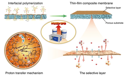 研究团队最新研制的超薄分离层的离子传导膜由致密的薄分离层和孔道贯通性良好的支撑层组成。足够薄且致密的分离层能够在保证高选择性的同时实现高传导率,支撑层则可提供机械强度。其分离层由聚酰胺交联网络构成,厚度仅为180 nm。交联的聚酰胺高分子网络就像一张结实的渔网,把尺寸较大的离子阻挡在外,尺寸较小的离子可顺利通过,从而实现离子高效筛分,利用该膜材料组装的单电池在260 mA/cm2的电流密度下,能量效率超过80%。