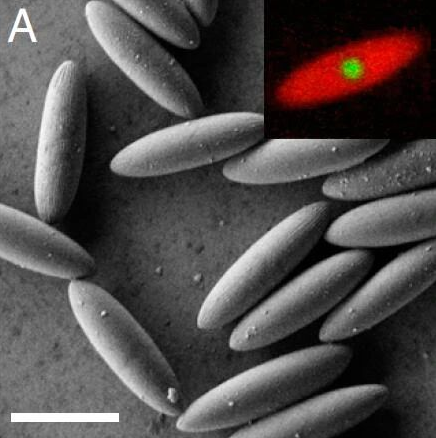 粒子的扫描电子显微镜照片,插图为共聚焦显微镜成像,横线长为5μm。图片来源:PNAS January 19, 2021 118 (3) e2018072118