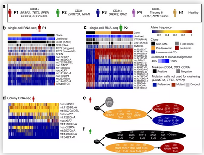 随后,研究人员对4名白血病患者的骨髓样本进行了单细胞多组学的MutaSeq数据分析,以确定患者体内的单个细胞是否为干细胞,并利用线粒体的体细胞突变谱系追踪该干细胞是否为癌性细胞,同时利用计算工具“mitoClone”进一步提高追踪的准确性。