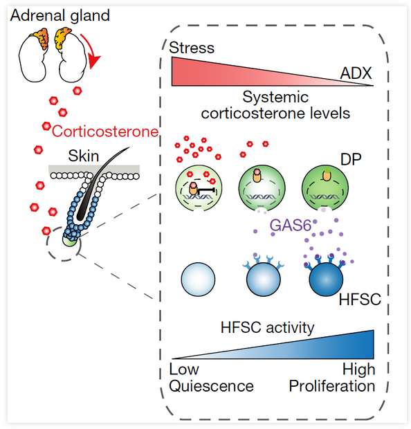 在野生型小鼠中,随着年龄的增长,小鼠的毛发生长周期中的休止期是逐渐变长。但是作者们发现在肾上腺切除的小鼠中,毛囊生长周期中的休止期长度只有两周左右,并且会以同步的方式反复进入毛发的生长期。另外,作者们发现ADX的小鼠中毛囊的形状的正常、毛发的种类正常同时也并没有出现毛发过渡生长的情况。这说明,肾上腺中可能会分泌一些关键的调节因子影响毛囊干细胞的休止期。