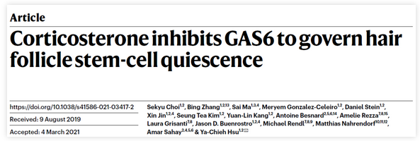2021年3月31日,许雅捷研究组再发Nature文章,题为Corticosterone inhibits GAS6 to govern hair follicle stem-cell quiescence,揭开了长期的、慢性的压力影响毛囊干细胞行为和抑制毛发生长的具体分子机制。