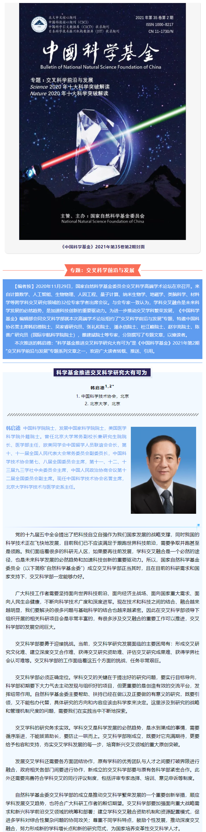 韩启德:科学基金推进交叉科学研究大有可为