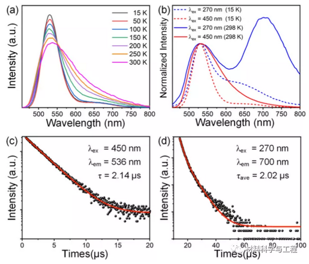 图 3. (a) CNCI晶体在450 nm激发下的温度相关PL光谱。(b) CNCI晶体的温度和激发波长相关PL光谱。(c, d) CNCI晶体在室温下不同激发和监测波长下的衰减曲线。
